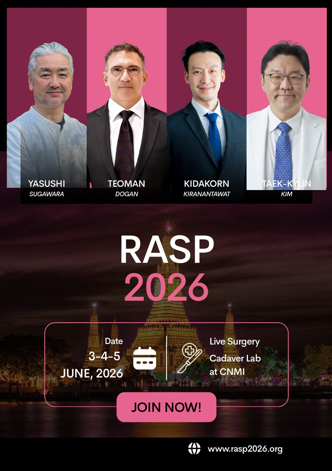 On behalf of plastic surgery division, department of surgery, Mahidol university at Ramathibodi hospital, it is our great pleasure to invite you to participate in the upcoming International Ramathibodi annual symposium of plastic surgery 2026 (RASP) which will be held in Bangkok, Thailand from 3-5 June 2026.